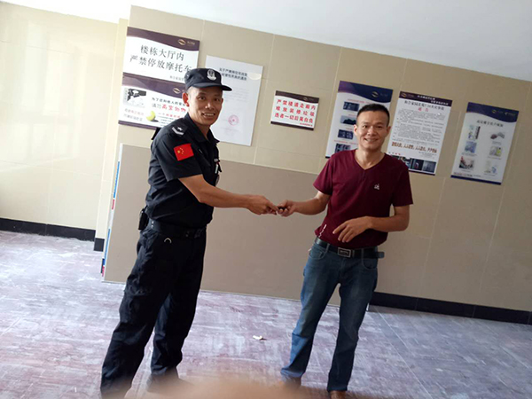 8月14日下午13點(diǎn)35分左右,和合三期值班保安黃永術(shù)在19幢拾得蘋果手機(jī)一部,想著失主很著急,手機(jī)里信息多,就在大廳來回走動(dòng),耐心等待失主來認(rèn)領(lǐng),大約過了20分鐘,一位姓曾的男子勿勿趕來,"保安大哥,看見一部蘋果手機(jī)沒有?”在確認(rèn)了男子的身份后,黃永術(shù)將手機(jī)“完璧歸趙”。心急如焚的曾先生拿到失而復(fù)得的手機(jī)后,激動(dòng)地一個(gè)勁兒說謝謝。