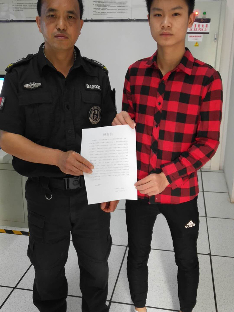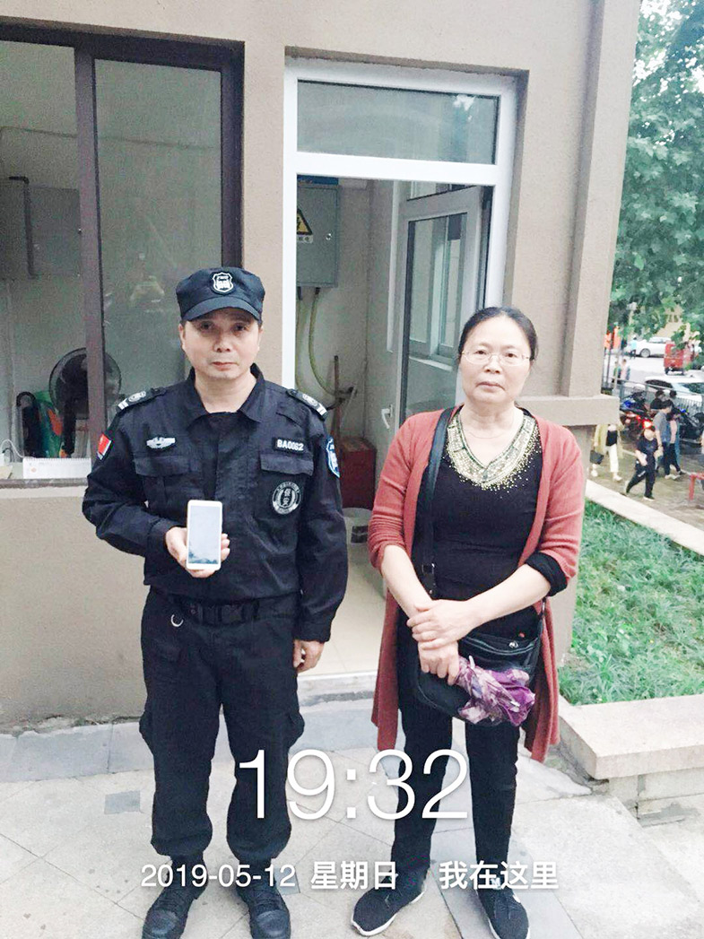 2、2019年5月8日上午11點(diǎn)08分,陽(yáng)光一百南區(qū)中威戰(zhàn)士謝金云正在執(zhí)勤時(shí),拾到一部蘋(píng)果手機(jī),擔(dān)心失主著急,謝金云立即上報(bào)隊(duì)長(zhǎng)并詢(xún)問(wèn)R區(qū)廣場(chǎng)上的路人是否有人遺失了東西,正在謝金云詢(xún)問(wèn)的過(guò)程中,他接到了失主程女士用其他手機(jī)撥過(guò)來(lái)的電話,謝金云這顆為失主焦慮不安的心才得以放下。謝金云告訴失主程女士讓她前往陽(yáng)光一百南區(qū)客服中心領(lǐng)取手機(jī),程女士連聲感謝。