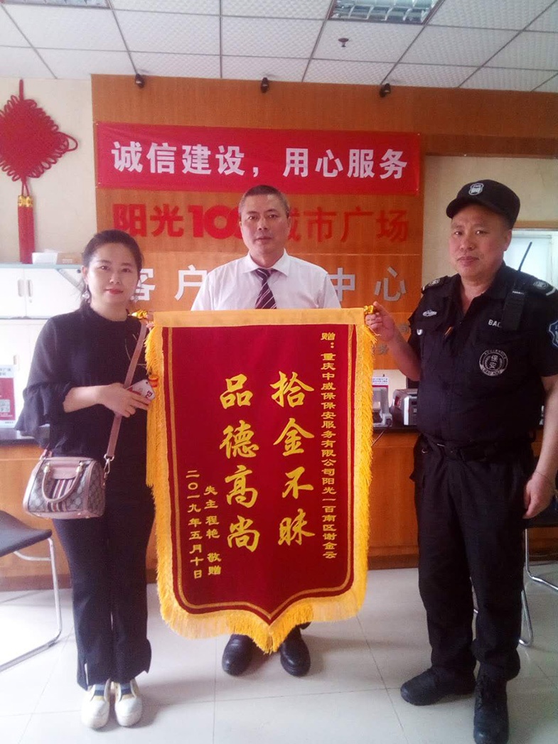 下午3點(diǎn)45分,程女士來(lái)到客服中心領(lǐng)取失物,經(jīng)客服中心人員仔細(xì)核實(shí)后將手機(jī)物歸原主。5月10日,程女士送來(lái)一面寫(xiě)有“拾金不昧 品德高尚”的錦旗表示感謝。