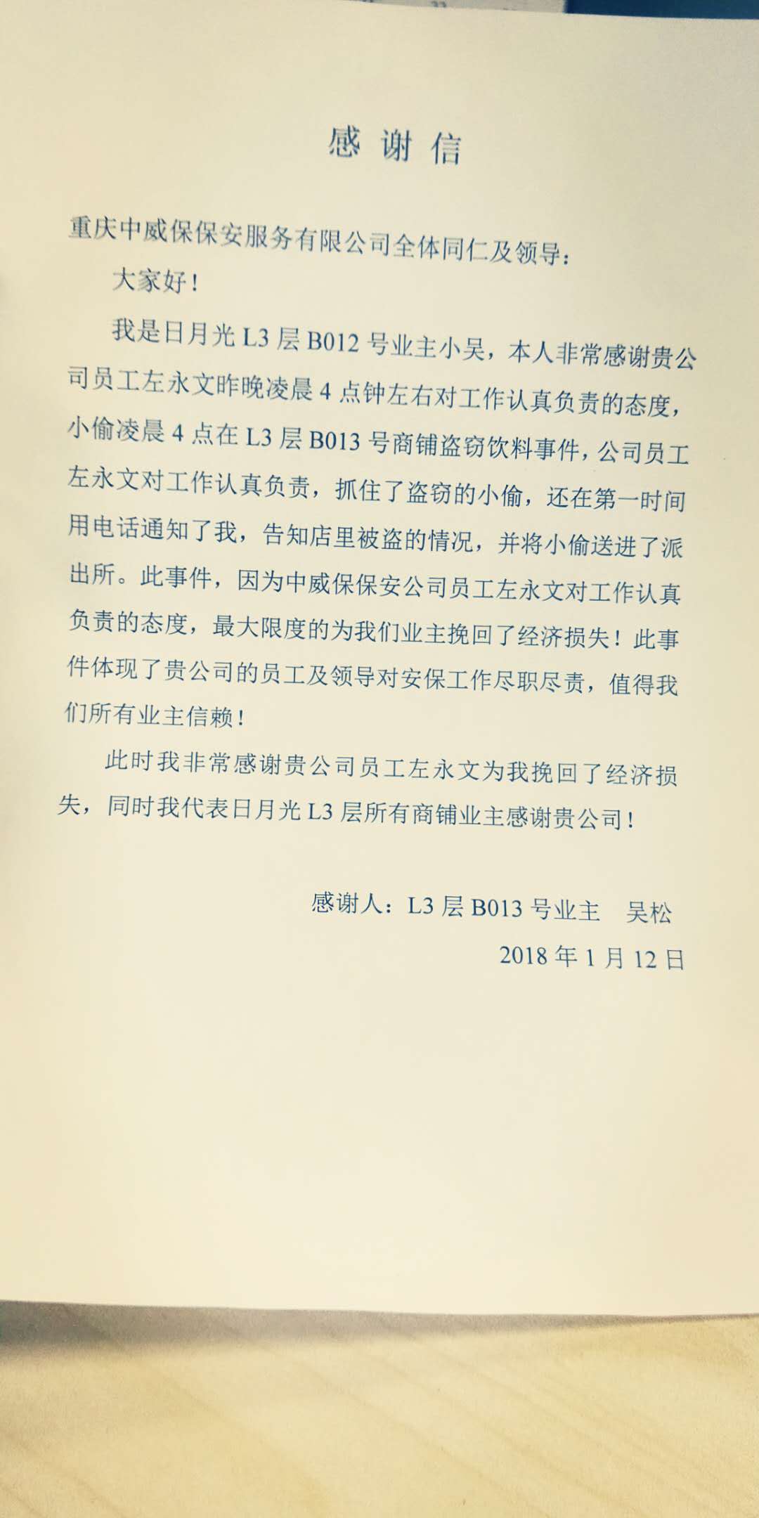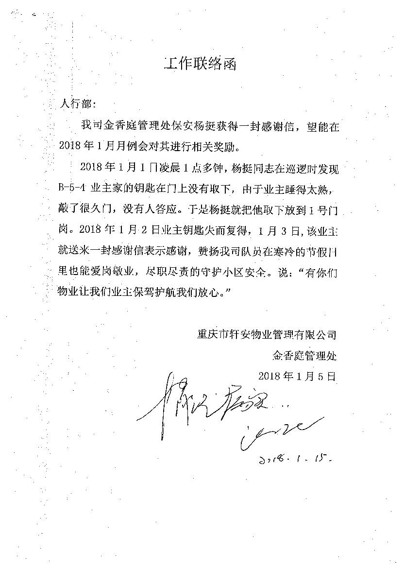 日月光保安認(rèn)真負(fù)責(zé)獲表?yè)P(yáng)信